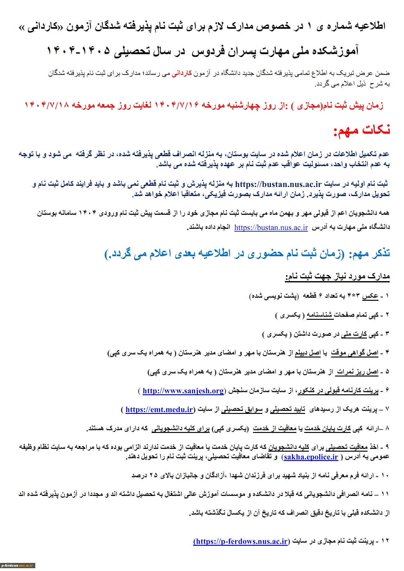 اطلاعیه شماره یک ثبت نام قبول شدگان کاردانی 1404 2